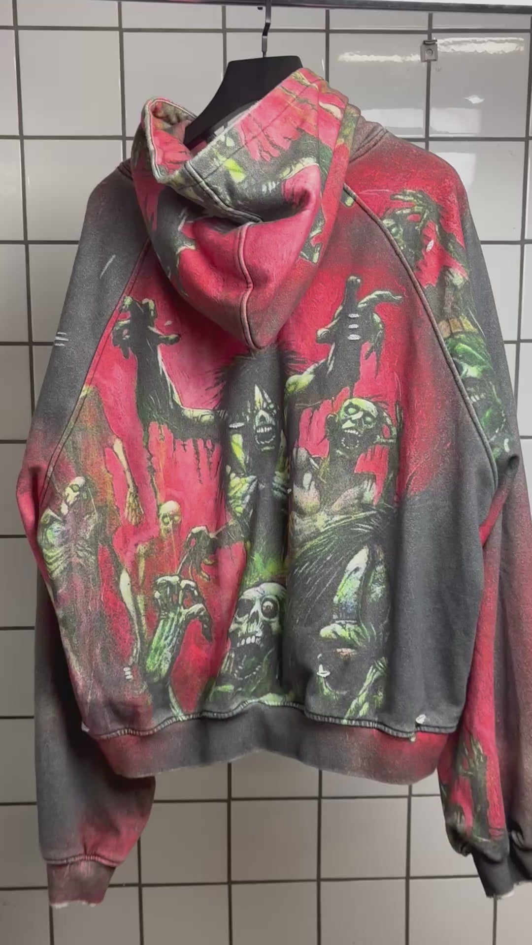 - All-over graphic print – blood-red backdrop, crawling with hand-painted demons and decaying silhouettes.
